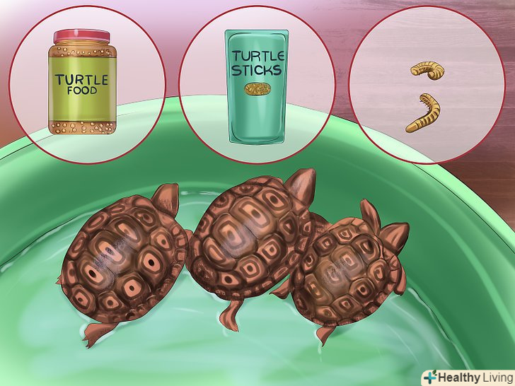 Забезпечте різноманітне харчування недавно вилупилися черепашатам. незважаючи на те, що спеціальний корм для водних черепах вже містить в собі всі необхідні поживні речовини, для здоров'я вашого вихованця буде корисна добре збалансована різноманітна дієта. [20] крім того, часом буває важко змусити недавно вилупилися черепашат взагалі що-небудь їсти, тому забезпечте їм різноманітність до тих пір, поки не знайдете те, чим вони віддадуть перевагу харчуватися. Нижче вказані види їжі, якими можна годувати маленьких черепашат. [21]- Корми у вигляді пластівців і гранул, спеціально призначені для черепашат (їх можна знайти в зоомагазині). Вони містять в собі всі необхідні вітаміни і поживні речовини, які потрібні молодій черепасі.
