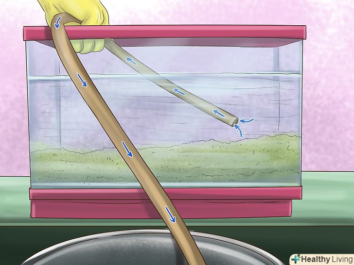 - Кожні 4-5 днів чистіть субстрат (камені або гравій на дні акваріума) за допомогою акваріумного сифона. Спершу почніть відкачувати воду закріпленої на сифоні грушею, а потім опустіть зовнішній кінець шланга в відро, розташоване нижче рівня води в акваріумі. Сила тяжіння змусить воду разом із забрудненнями самостійно перетікати з акваріума в відро.