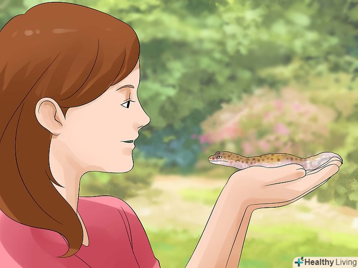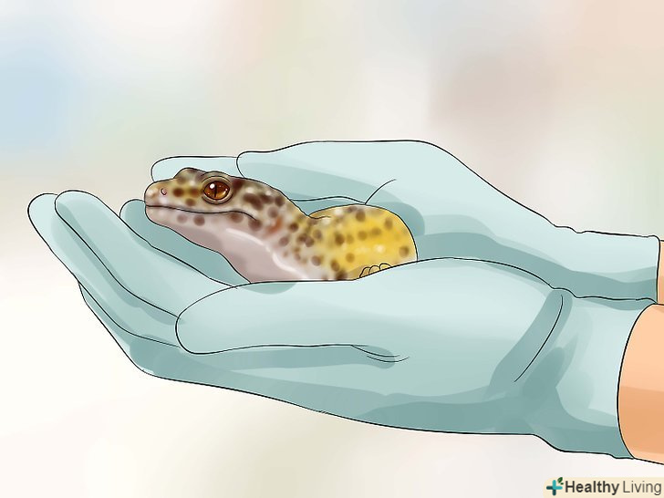 Беріть гекона в руки дуже обережно. намагайтеся брати гекона в руки якомога рідше, особливо якщо він ще не звик до вас і до умов свого утримання. Деякі гекони кусаються, коли їх беруть в руки. [26] якщо вам все-таки треба взяти гекона в руки, робіть це дуже обережно, намагаючись не налякати тварину і не заподіяти йому шкоди.- Якщо ви знаєте, що гекон кусається, одягніть рукавички. Це захистить вас від укусів, і ви не впустите гекона з рук від несподіванки, якщо він вирішить вас вкусити.