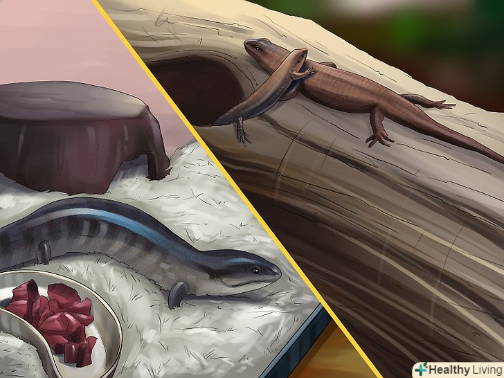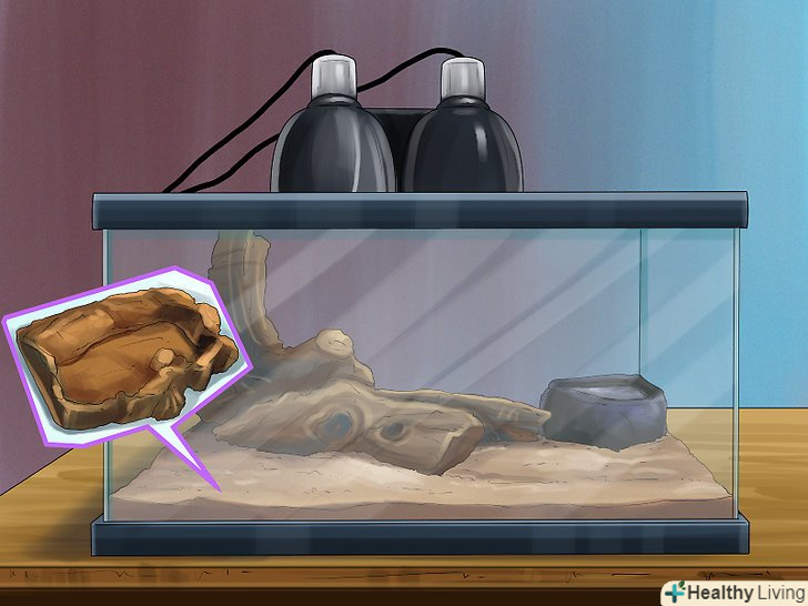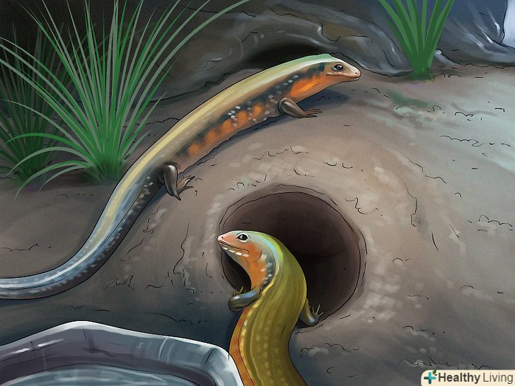 Надайте сцинку достатню кількість укриттів і місць для копання в субстраті. Сцинку може ставати нудно і навіть тривожно, якщо у нього не буде укриттів. Загляньте в зоомагазин і підшукайте для вихованця відповідні укриття. Розташуйте три Укриття в різних зонах акваріума, щоб сцинку було куди сховатися, коли він захоче усамітнитися. [5]- Слідкуйте за тим, щоб шар субстрату становив 15 см.він теж при бажанні дозволить сцинку ховатися в ньому.
