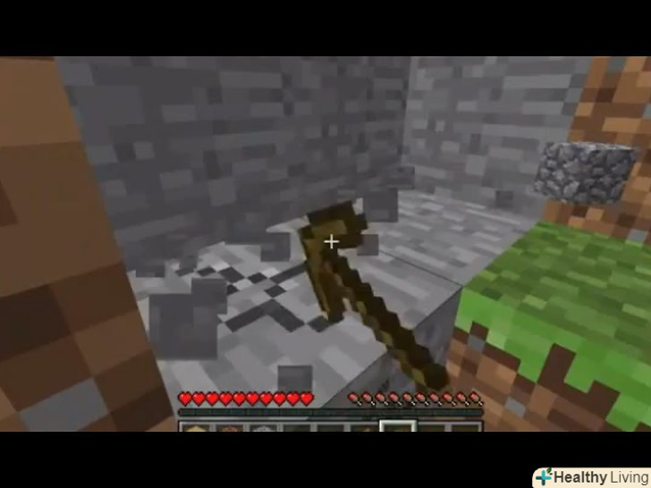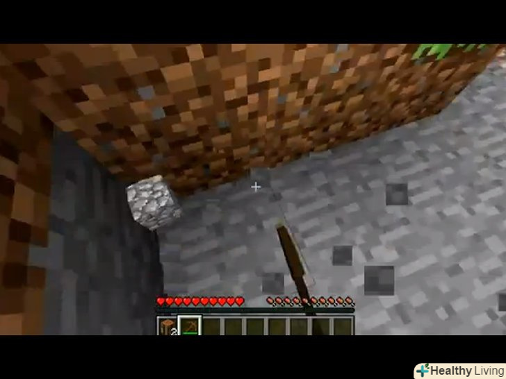 Зберіть достатню кількість каменю (приблизно 12 блоків), щоб зробити кам'яну кирку.Зберіть ці камені, використовуючи дерев'яну кирку.