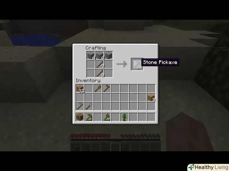 Зробіть кам'яну кирку.скрафтіть дві палиці і три блоки каменю, таким же чином, як ви зробили і з дерев'яною киркою, використовуючи замість дощок, камені. На верстаті, це повинно виглядати наступним чином: