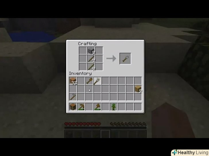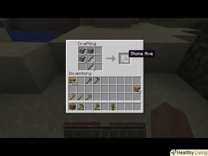 Зробіть кам'яну сокиру.скрафтіть дві палиці і три кам'яних блоку наступним чином, щоб зробити кам'яну сокиру: