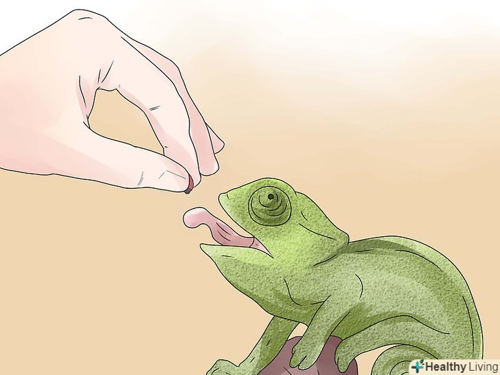 Годуйте хамелеона. найбільш поширеним кормом для хамелеонів є цвіркуни. Їх можна придбати в найближчому зоомагазині, або замовити через Інтернет або по телефону. Не годуйте хамелеона бджолами і осами. [5]- Маленьким хамелеонам потрібні більш дрібні цвіркуни. Крім того, вони охоче поїдають плодових мушок.