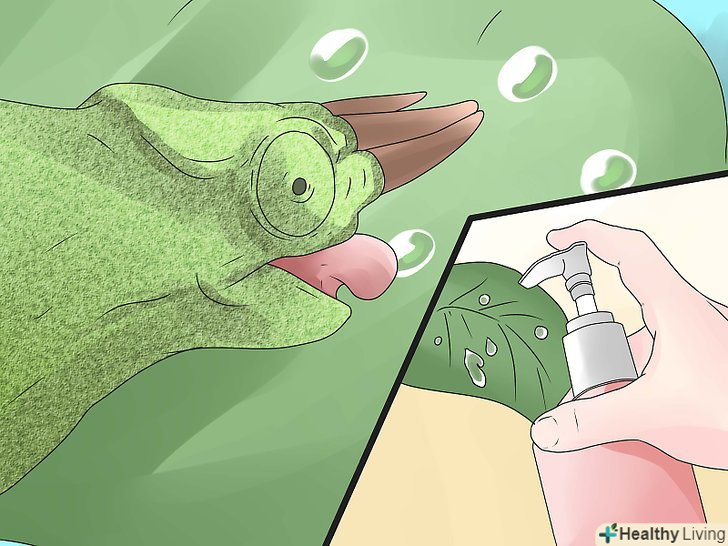 Давайте хамелеону воду. є різні способи робити це. Якщо ви помітили, що хамелеон облизує блискучі предмети, значить, він відчуває спрагу і шукає росу. [6]- Обприскуйте водою з пляшки з розпилювачем листя або стінки тераріуму, щоб хамелеон міг злизувати вологу.