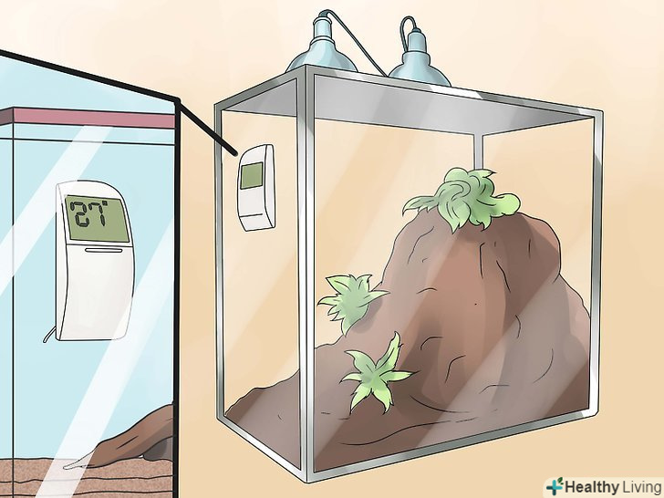Простежте, щоб хамелеону вистачало тепла. по-перше, слід розмістити в клітці термометр. По-друге, встановіть вгорі тераріуму нагрівальну лампу. В цьому випадку хамелеон зможе при бажанні підніматися і ніжитися в теплі і спускатися вниз, коли йому стане занадто жарко. Для цієї мети підійде і проста 60-ватна лампа розжарювання (проте все одно знадобиться повний спектр, так як побутові лампочки не випромінюють світло в ультрафіолетовому діапазоні). Теплий ділянку повинен мати температуру 29-33 градусів Цельсія.- Хамелеони віддають перевагу більш низькій температурі вночі, але в більшості звичайних будинків це не проблема.
