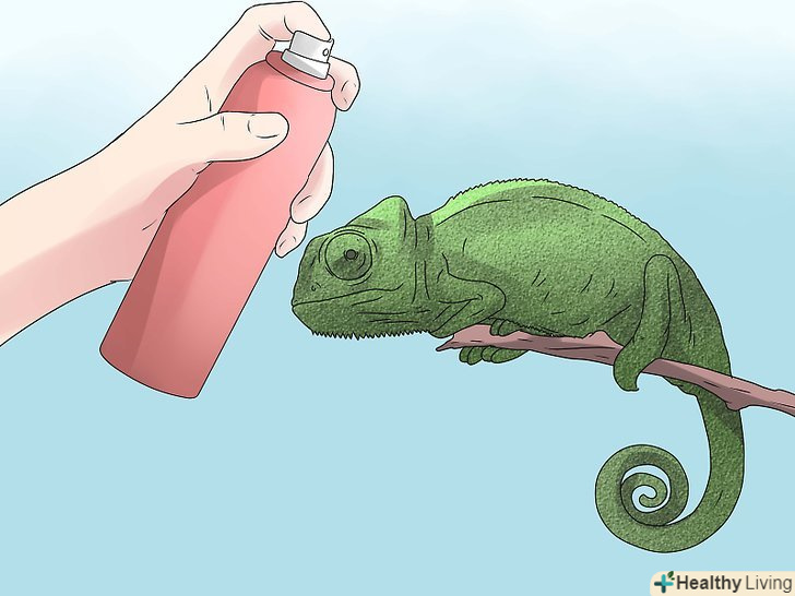 - Обприскуйте житло хамелеона водою. Пляшку з розпилювачем можна придбати в найближчому магазині. Обприскуйте водою листя домашніх рослин, щоб підтримувати відповідний рівень вологості і забезпечити рослини вологою. Слідкуйте, щоб вода була теплою, але не гарячою.