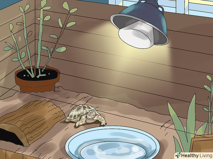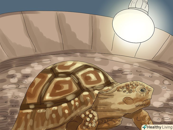 Забезпечте своїй домашній черепасі відповідне освітлення. якщо ви тримаєте її поза приміщенням, тоді вам не потрібно турбуватися про те, чи достатньо у неї або у нього світла. Але якщо ваш улюбленець живе в приміщенні, тоді вам потрібно переконатися в тому, що світла достатньо, отже, вистачає вітаміну Д для здоров'я. Ось кілька речей, які потрібно врахувати при налаштуванні освітлення для вашої черепахи: [7]- У сухопутної черепахи повинно бути дві лампи: гріюча лампа і ультрафіолетова потужністю 10uvb, щоб черепаха була забезпечена світлом, теплом і ультрафіолетом.Важливо! Ультрафіолетова лампа повинна бути спеціально для рептилій і продаватися в зоомагазинах і акваріумних салонах, побутові УФ-лампи не підходять і небезпечні для черепах!