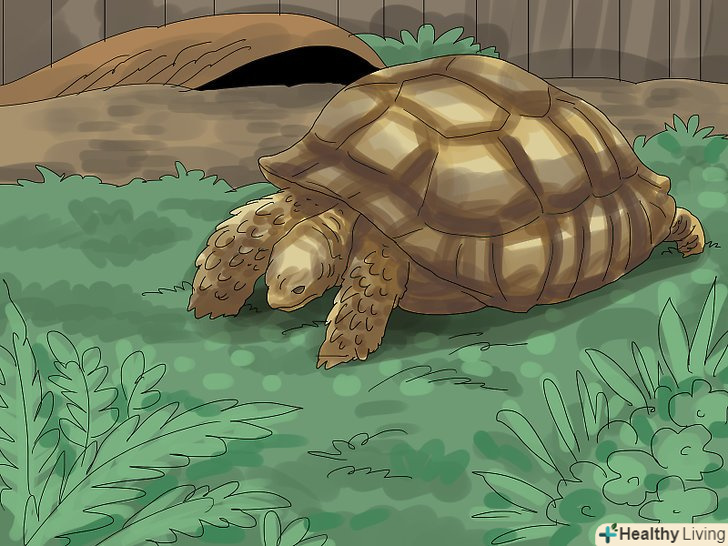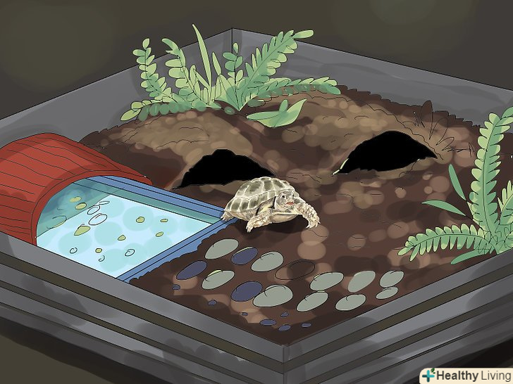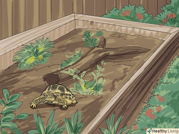 Заохочуйте свою черепаху. у вашої черепахи повинна бути цікава навколишнє середовище, щоб вона не нудьгувала і залишалася активною. Ви можете додати кілька пучків трави, щоб черепаха могла рити, а також, допомогти їй сховатися в тіні. Ви можете поставити там кілька бруківок, щоб забезпечити черепасі усамітнення, якщо тільки вони не надто гострі. Також ви можете висадити кілька маленьких дерев, щоб була тінь і притулок, і для поліпшення зовнішнього вигляду навколишнього середовища.