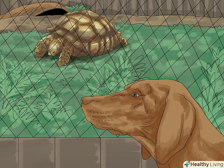Захищайте свою черепаху від інших тварин. якщо ваша черепаха утримується поза приміщенням, тоді вам слід вжити заходів обережності, щоб зберегти її від інших хижаків, наприклад від кішок. Якщо у вас є собака, ніколи не підпускайте її до черепахи; навіть самі виховані собаки можуть атакувати черепаху без попередження. Хоча і не можна повністю захистити черепаху від птахів, лисиць або інших хижаків, постарайтеся забезпечити їй захист наскільки це можливо, будуючи притулку і місця, де вона може сховатися, зберігаючи огорожу в недоторканності і спостерігаючи за зовнішнім середовищем. [9]- Деякі рекомендують покрити будинок молодої черепахи дротяною сіткою для захисту від настирливих тварюк.