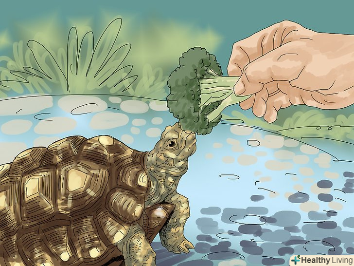 Годуйте вашу черепаху. той тип їжі, який вживає черепаха, дуже залежить від її виду. Важливо запитати там, де ви її купуєте, яку їжу можна зробити частиною її основного раціону. В основному, більшість черепах їдять різноманітну листову зелень, на зразок "весняної суміші", яку ви зможете знайти в будь-якому продовольчому магазині. Коли черепахи ще маленькі, їм потрібна більш ніжна їжа, так як їх крихітним щелепам буде важко справлятися з грубою їжею. Основу раціону сухопутної черепахи повинні складати бур'яни, листя їстівних рослин і сіно (80%), потім дозволені до годування черепах овочі (15%) і фрукти (5%) .- Також Вашій черепасі знадобляться добавки, щоб бути впевненим в тому, що вона або він росте здоровою і сильною. Черепасі знадобиться добавка кальцію двічі на тиждень, мультивітамінні добавки два або три рази на тиждень, і добавка вітаміну Д3, якщо вона живе в приміщенні і не отримує сонячного світла.