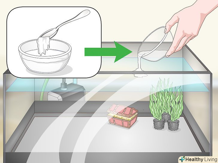 Розчиніть ремінералізуючу сіль в деякій кількості води, а потім додайте в акваріум. додайте трохи води в відміряну кількість засобу для підвищення жорсткості, щоб отримати розчин. Неквапливо залийте розчин в ту зону акваріума, в якій присутня найбільша течія, щоб вода швидко перемішалася і плавно змінила свої параметри. [4]- Обов'язково забезпечте належну аерацію акваріума.