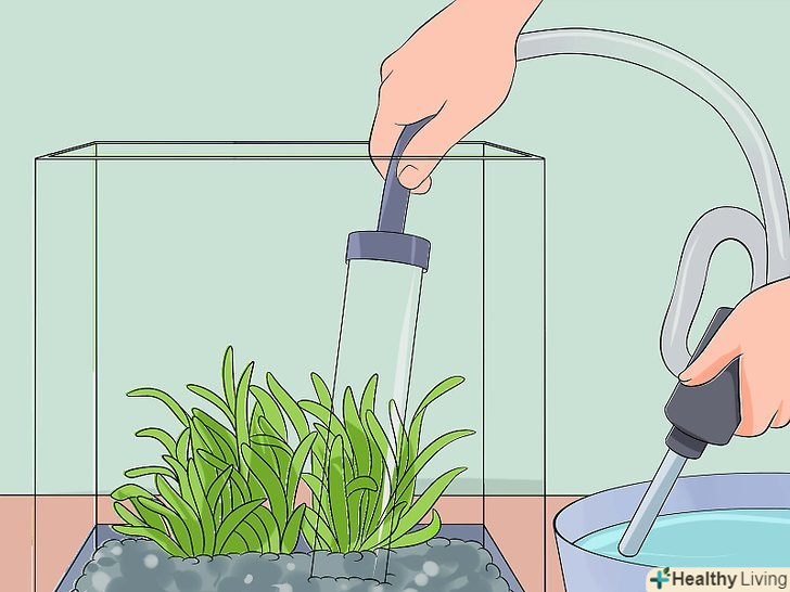 - Для часткової підміни води в акваріумі потрібно злити з нього 10-15% наявного обсягу води і долити в акваріум свіжу дехлоровану водопровідну воду. При зливі брудної води можна користуватися сифоном, щоб з його допомогою очистити від забруднень гравій і декорації акваріума. Чистіть сифоном лише 25-33% площі гравію і декорацій. Також вам буде необхідно скористатися спеціальним скребком для видалення водоростей зі стінок акваріума, перш ніж ви почнете зливати з нього брудну воду. [18]