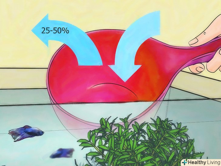 Злийте частину старої води з акваріума з півниками. для часткової підміни води необхідно злити частину старої води з акваріума з рибами і залити замість неї свіжу оброблену воду. Скористайтеся чистим черпаком або іншим подібним предметом і злийте з акваріума 25-50% старої води. [4] [5] [6] не відкидайте риб з акваріума, коли будете зливати з нього воду.- Для більшої точності можна вимірювати обсяг зливається з акваріума води. Наприклад, якщо у вас Акваріум об'ємом 80 літрів, то ви можете злити з нього до 40 літрів води, відміряючи потрібний обсяг мірними глечиками або інший тарою.