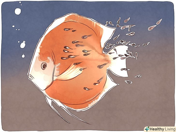 Зменшіть рівень води перш, ніж молоді особини відкріпляться від ікри. через кілька днів після того, як рибки вилупляться з ікри, вони відкріпляться від неї і будуть плавати за батьками, харчуючись з їх шкіри. Якщо ви зменшите рівень води в акваріумі На 25см, рибкам буде легше знайти батьків. [14]- Дорослих особин зі світлою шкірою і непримітним забарвленням буде знайти складно.