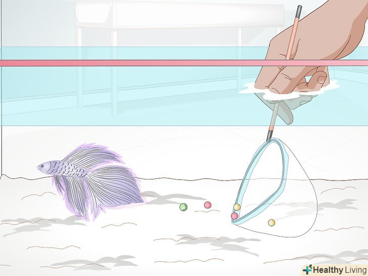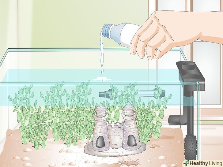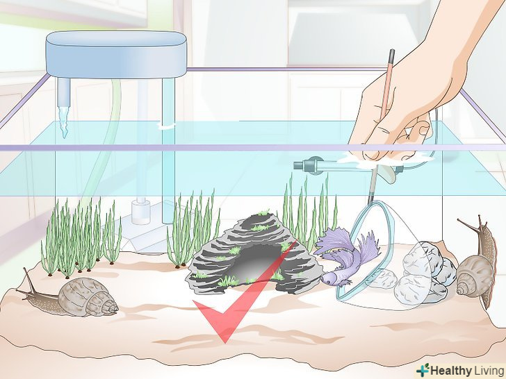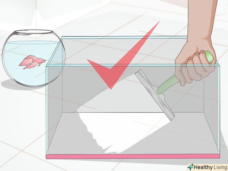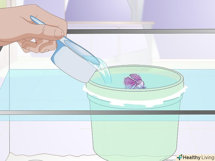 Не забувайтеЧистити акваріум . щоб помити Акваріум, помістіть вашого півника в контейнер, заповнений старою водою з акваріума. Просто помийте Акваріум гарячою водою, так як деякі види мила можуть нашкодити вашій рибці. Якщо в акваріумі є камені, також їх гарненько промийте. Заповніть Акваріум до половини свіжою водою, поверніть туди півника і трохи старої води, а потім долийте ще свіжою.- Не забудьте скористатися дехлоринатором (також відомим як кондиціонер для води), щоб видалити шкідливий хлор/хлорамін, що міститься у водопровідній воді, який може вбити вашу рибку. Він також відфільтрує бактерії.
