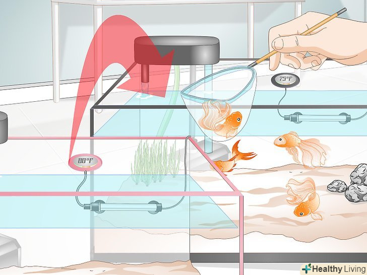 Симулюйте настання весни, знизивши температуру води, а потім поступово збільшивши її. Золоті рибки розмножуються навесні, тому Ви повинні відтворити прогрів води. Для цього спочатку знизьте температуру до 10-12°C. Потім, коли будете готові розводити рибок, піднімайте температуру на 2°C в день до досягнення 20-23°C.