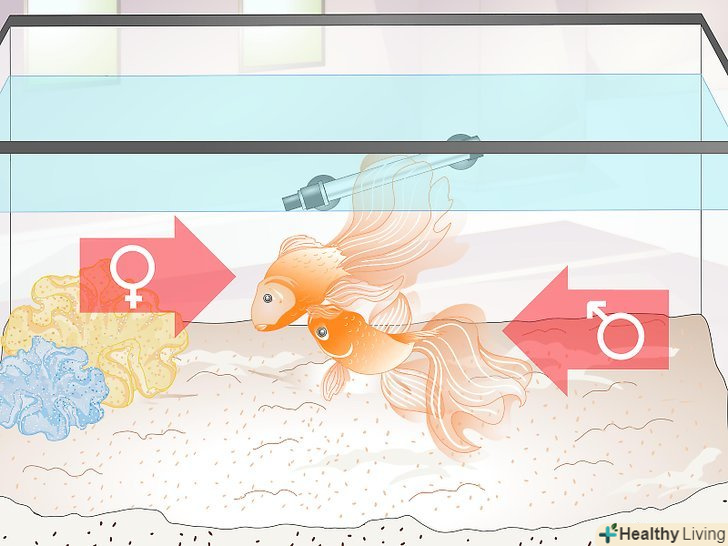 Виберіть кращі екземпляри для розведення. ідеально використовувати молодих міцних золотих рибок через їх високу фертильності і бажання розмножуватися. Серед самочок пошукайте ту, що має великі задню і грудну частини. Серед самців - великі (приблизно 10-15 см), які ще й швидкий плавець. Самці з великою кількістю маленьких горбків позаду голів на зябрах володіють усіма ознаками ідеальної для розведення риби.- Для отримання ідеальної групи розведення спробуйте відсадити три кращих самця і дві кращих самки золотих рибок.