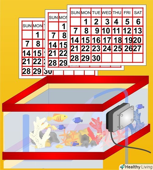 Дозвольте акваріуму " розвиватися»: це означає, що вам доведеться почекати до тих пір, поки тести на аміак і нітрити будуть негативними. Можна додати в пісочне ложе трохи замороженого корму для риб, це прискорить цикл. Але це не потрібно, якщо ви додали живі камені. Там вже досить мертвих ракоподібних і черв'яків через пересилання. Весь процес може зайняти 1-6 тижнів. Цвітіння водоростей може бути природною частиною процесу. Перевірте солоність і переконайтеся, що вона постійна і знаходиться на рівні 1.023 – 1.026. Це не означає, що солоність може бути сьогодні 1.023, а завтра 1.026. Підберіть необхідну Вам солоність і підтримуйте її на тому рівні. 1.025-1.026-оптимальна солоність для коралів, солоність нижче не підходить для дна/коралів. Акваріум тільки з рибами можна утримувати при солоності 1.021-1.026. Компенсуйте витрату води на випаровування додаванням зворотноосмотичної / деіонізованої води. Підтримуйте постійної температуру, а також рівні кальцію і лужності. Якщо ви не маєте уявлення про те, що потрібно додавати, не використовуйте додаткові хімічні речовини, просто міняйте воду. Цвітіння водоростей-звичайний процес протягом перших 6 місяців життя вашого акваріума, тому не лякайтеся, коли побачите нові зростаючі водорості. Просто підтримуйте чистоту і міняйте до 10% води щотижня. Як тільки Акваріум стабілізувався, можна знизити частоту зміни води. Переконайтеся в тому, що свіжа вода була попередньо підігріта і перемішана в окремій ємності перед додаванням в акваріум.
