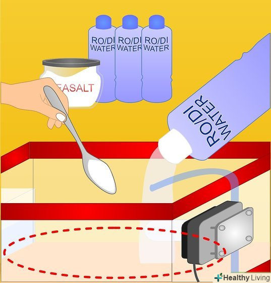 Підготуйте достатньо синтетичної морської води для необхідного обсягу. використовуйте тільки якісну акваріумну сіль хорошої фірми і воду, очищену фільтром зі зворотним осмосом і деіонізатором. Можна також заповнити акваріум зворотноосмотичної або деіонізованою водою і додати сіль. Важливість системи зворотноосмотичного очищення / деіонізації складно переоцінити. Водопровідну воду теж можна використовувати, але тоді ваш акваріум залишається у владі можливої появи шкідливих хімічних домішок, які можуть там бути. Хороша система зворотноосмотичного очищення / деіонізації не дуже дорога, і повинна вважатися необхідністю. Хороший вибір-моделі, що пропускають 100 галонів (378 л) в день, оскільки вони зручні тим, що не потрібно довго чекати очищену воду. Якщо ваш акваріум менше, ви можете купувати зворотноосмотичну воду в магазині. Використання дистильованої води не рекомендується, тому що в дистиляторах використовуються мідні труби, а мідь токсична для більшості безхребетних, включаючи корали, Декоративні креветки, і т. д.