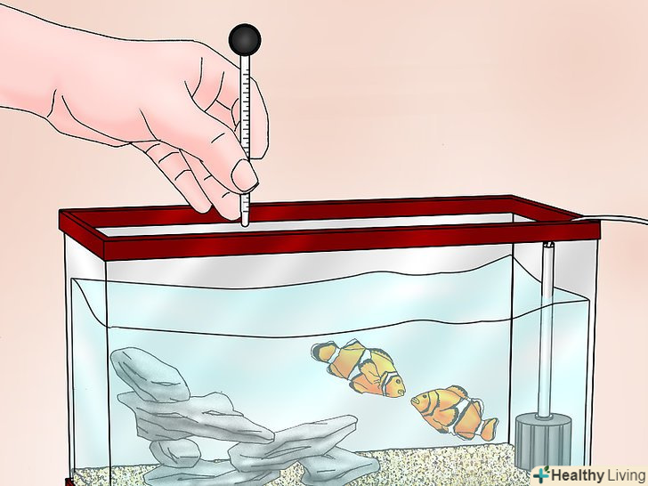 Підтримуйте в акваріумі тропічну температуру. риба-клоун мешкає в тропічних регіонах океану, а саме в більш теплих областях Східної частини Індійського океану і на заході Тихого океану, від екватора до Австралії. [7] щоб повторити теплий м'який Клімат тропіків, підтримуйте температуру акваріумної води в інтервалі 24-30 градусів Цельсія.- Якщо ви не живете в тропіках, можна підігрівати воду в акваріумі за допомогою підводного нагрівача. Такі нагрівачі нагадують тонкі трубки, які вставляються в воду в кутку акваріума. Нагрівачі відрізняються за величиною та потужністю, тому вибирайте той, який підходить для вашого акваріума.