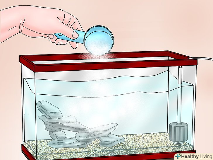 Встановіть фільтрувальну систему. хороша фільтрувальна система вкрай важлива для будь-якого акваріума (особливо для невеликих акваріумів, як зазначалося вище). На відміну від океану, в акваріумі біологічні відходи не несуться течією, тому їх необхідно видаляти за допомогою фільтра, щоб вони не накопичувалися у воді, інакше вони можуть завдати шкоди рибі. Хоча фільтрувальні системи відрізняються великою різноманітністю, нижче наведені деякі дуже загальні правила, якими слід керуватися при виборі донного фільтра для акваріума з солоною водою (більше інформації ви дізнаєтеся з інструкції до фільтру або у продавців зоомагазину):- Промийте всі частини фільтрувальної системи і помістіть Нижні фільтри (вони зазвичай нагадують квадратні решітки або пластини) на дно акваріума.
