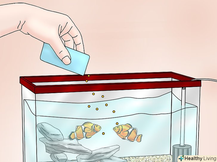 Годуйте рибу приблизно раз на день. у порівнянні з іншими, більш розбірливими видами акваріумних рибок, риба-клоун не вибаглива в їжі. Їй підходить більшість звичайних сортів корму для морських акваріумних риб. Для кращого росту спробуйте щодня додавати в акваріум щіпку рибного корму. Давайте рибці таку кількість корму, щоб вона встигала повністю з'їдати його протягом 2-3 хвилин. [6]- Зазвичай риби-клоуни нормально почувають себе і в тому випадку, якщо їх годувати через день. Проте, такий режим харчування уповільнює їх зростання.