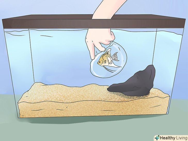 Акліматизуйте скалярій. як і всіх інших риб, скалярій необхідно акліматизувати в їх транспортувальному контейнері протягом 15-30 хвилин, помістивши його в акваріум, щоб вирівняти температуру та інші параметри. Після проведення акліматизації обережно вийміть скалярію сачком з контейнера і посадіть в акваріум. Не виливайте воду з контейнера в акваріум.