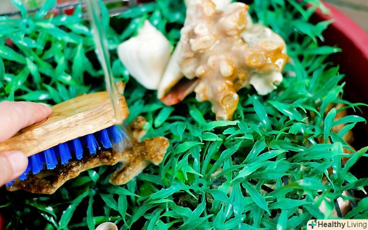 Спочатку вичистіть декор. витягніть всі декоративні елементи з акваріума і акуратно протріть їх м'яким милом. Добре промийте.