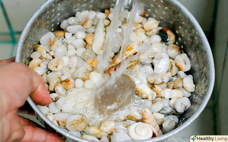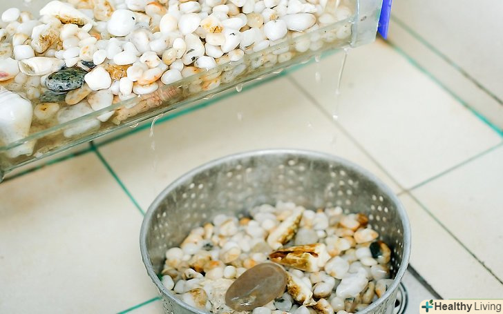 Візьміть друшляк і влийте в нього воду з акваріума разом з гравієм. це може звучати гидко, але це найпростіший спосіб відокремити екскременти, якщо ви, звичайно, не хочете їх вибирати вручну. Ви можете купити окремий друшляк для цієї процедури. Воду з акваріума можете попередньо не виливати.
