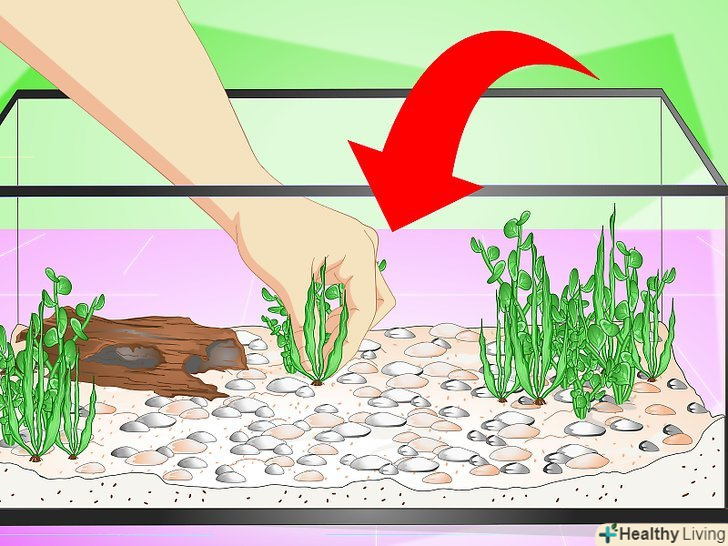 Прикрасьте Акваріум. як правило, золоті рибки воліють обстановку у вигляді палацу або замку. Спорудити щось середнє. Дно акваріума необхідно покрити галькою, і бажано розмістити в ньому водорості. При виборі декорацій, гальки і водоростей дотримуйтеся наступних правил: [1]- Підберіть відповідну гальку. Не використовуйте дрібний гравій, так як це небезпечно. Золоті рибки риються в грунті. Вони підхоплюють камінчики і грають ними. Використовуйте досить велику гальку, щоб рибка не могла проковтнути її.