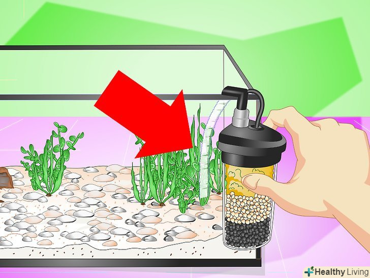 Встановіть фільтрувальну систему. ваш акваріум не обійдеться без фільтра. Фільтри розрізняються за швидкістю потоку води і вибираються відповідно до обсягу акваріума. Акваріумні фільтри діляться на два типи: внутрішні і зовнішні. [2]- Зовнішні фільтри розташовуються за межами акваріума, а внутрішні занурені в нього. Для акваріума з золотими рибками придатні фільтри обох типів.