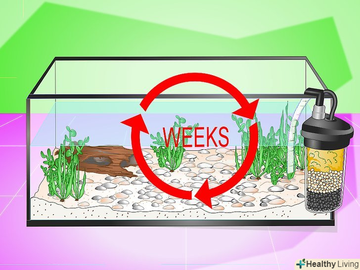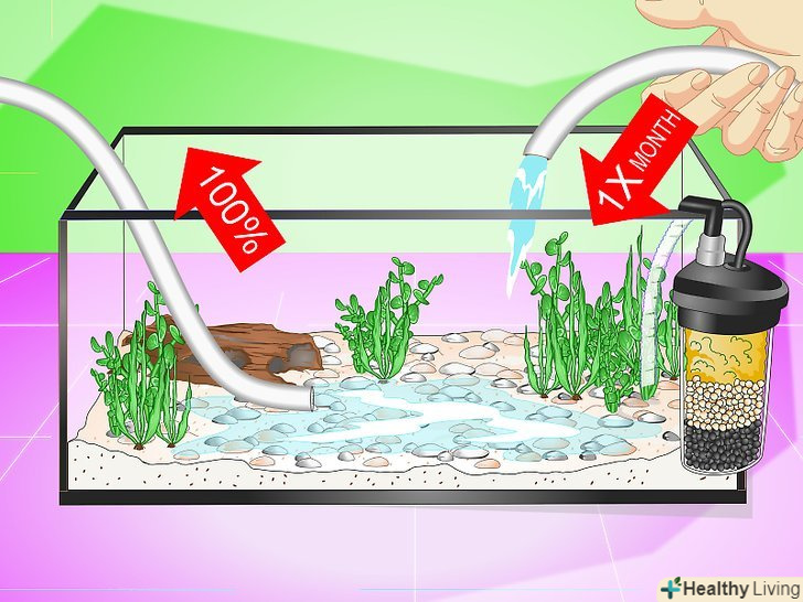 Раз на місяць повністю міняйте воду. слід регулярно зливати з акваріума стару воду і наповнювати його свіжою. Мета даної процедури полягає в тому, щоб оновити колонії корисних бактерій, які в основному формуються на фільтрі і гальці. Ці бактерії очищають воду, переробляючи виділяється рибами аміак. [7]- Після того як наповніть Акваріум свіжою водою і включіть фільтр, додайте у воду нашатирний спирт. Продовжуйте потроху додавати нашатирний спирт, до тих пір поки в акваріумі На розмножаться бактерії, які повністю поглинуть аміак і нітрити.