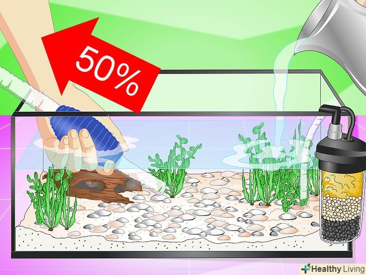 Раз на тиждень частково міняйте воду в акваріумі. будемо відверті: золоті рибки досить швидко забруднюють воду, і їм не подобається плавати серед своїх випорожнень. Вам би теж не сподобалося. Скупчилася бруд дратує золотих рибок і погіршує їх самопочуття. Щоб очистити акваріум, міняйте 25-50% води раз на тиждень. [6]- При частковій заміні води промивайте фільтр і знаходяться в акваріумі предмети зливається водою. Ні в якому разі не використовуйте для цього звичайну проточну воду, щоб не змити корисні бактерії.