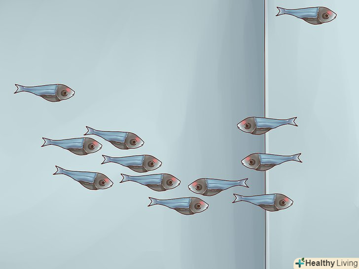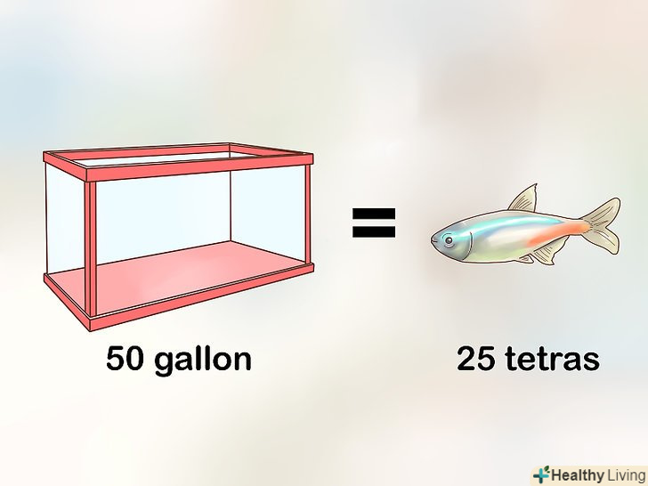 Обмежте кількість риб однієї дорослої особиною на дев'ять літрів води. це загальне правило допомагає визначитися з тим, яку оптимальну кількість риб можна утримувати в акваріумі конкретного обсягу. Для розрахунків вам необхідно лише поділити обсяг вашого акваріума на дев'ять, і ви отримаєте ту кількість дорослих неонів, яке рекомендовано в ньому містити. [16]- Наприклад, якщо у вас встановлений акваріум об'ємом 220 літрів, то в нього можна посадити 25 неонів.