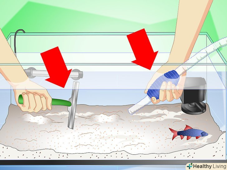 Раз на тижденьЧистіть Акваріум . при чищенні акваріума немає необхідності діставати з нього весь грунт (пісок або гравій). Проте, за допомогою сифона слід зібрати весь бруд і сміття, які скупчилися на дні акваріума. Скребком видаліть водорості зі стін акваріума. Після цього злийте 10-15% старої води і замініть її на нову.- Не діставайте рибу з акваріума при заміні води, так як це викличе у неї непотрібний стрес.