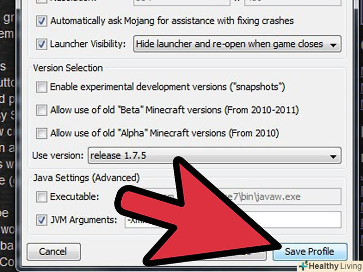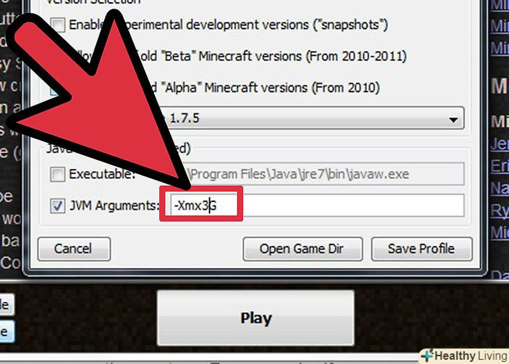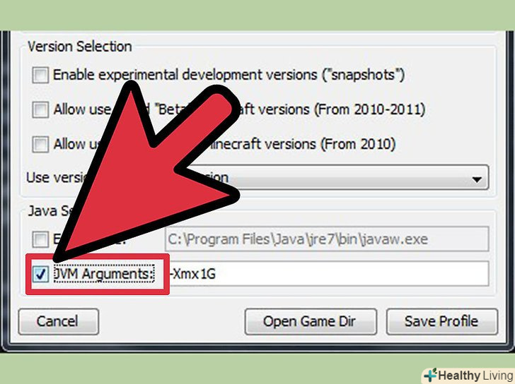 Увімкніть опцію " JVM Arguments "(аргументи Java). у розділі «Java Settings (Advanced)» (Налаштування Java [Додаткові]) поставте прапорець у «аргументи JVM». Так ви зможете вводити команди, щоб редагувати програму Minecraft.