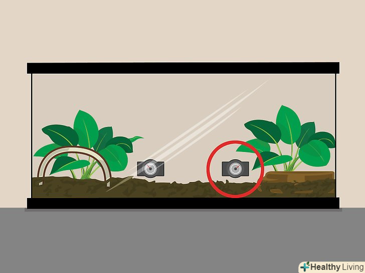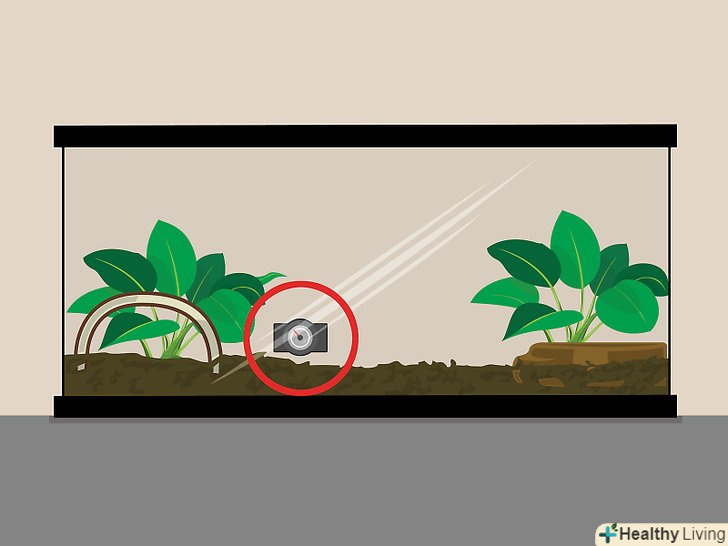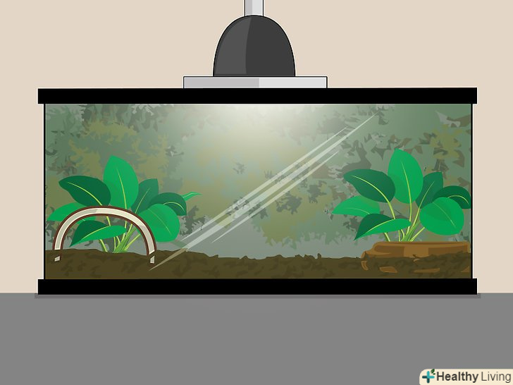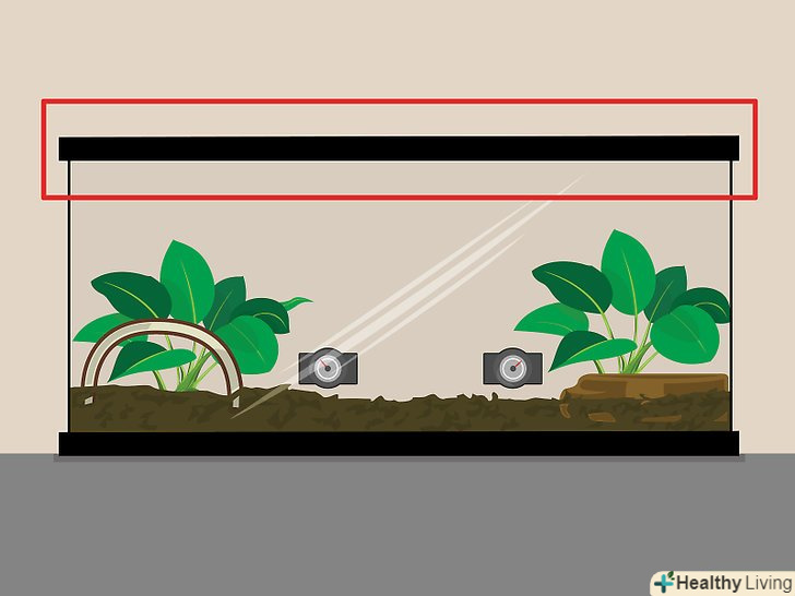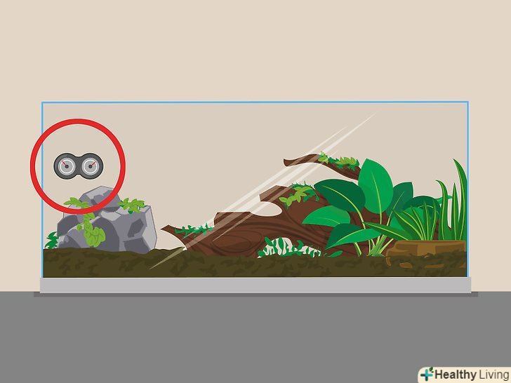 Прикріпіть термометр і вимірювач вологості. переконайтеся, що вони показують необхідні цифри: температура близько 28ºС вдень і 25ºС вночі, вологість близько 80-90%. В якості "опалення" краще використовувати підкладки під акваріум, так як лампи розжарювання можуть створити занадто суху атмосферу.
