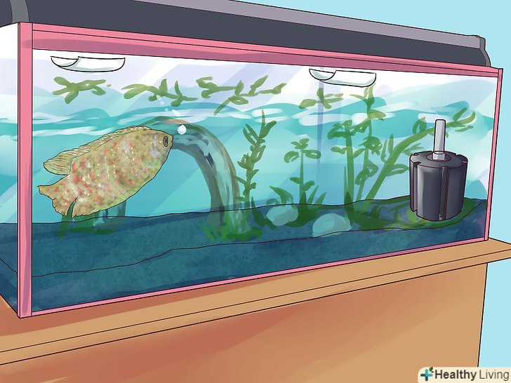 Помістіть в акваріум плаваючі рослини або предмети. деякі види (наприклад, перлинні гурамі), роблять гнізда з піни з нижньої сторони плаваючого рослини. Можна використовувати спеціальні рослини або вирізати фігуру з пінопласту. [8] якщо ваш вид гурамі не робить гнізда (як цілуються гурамі), можна просто покласти в акваріум шматочок листа салату. Він стане харчуванням для мальків.- Заповніть Акваріум лише на дві третини. Гурамі отримують кисень як з води, так і з повітря.