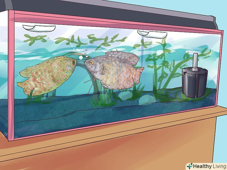 Підберіть акваріум потрібного розміру. більшості пар підійде акваріум, в який поміститься 40-80 літрів вода і залишиться 15 сантиметрів простору зверху. [3] відносно невеликий розмір і маленька глибина сприяють розмноженню, але це підходить не всім видам гурамі. Ось кілька винятків:- Цілуються гурамі можуть розмножуватися тільки у великих акваріумах: глибиною не менше 60 сантиметрів і довжиною не менше 90 сантиметрів. [4]