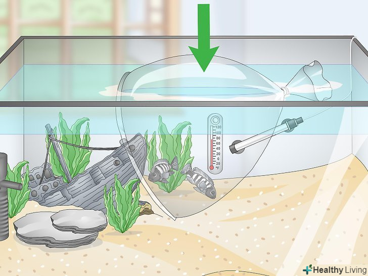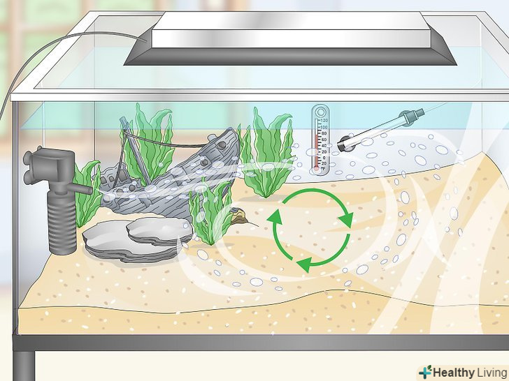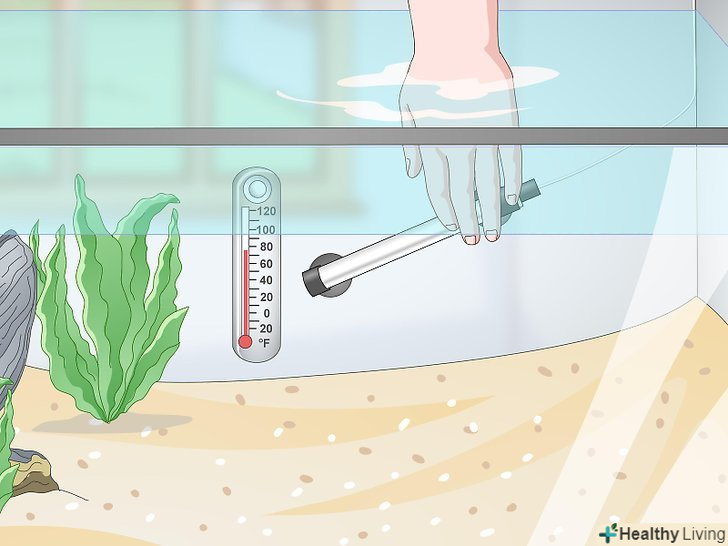 Встановіть в акваріум водонагрівач і термометр, щоб контролювати температуру води. Тропічні риби найкраще себе почувають в теплій воді, тому водонагрівач і термометр відносяться до важливого обладнання для акваріума. Встановіть водонагрівач в акваріумі біля задньої стінки і включіть його для того, щоб він почав підігрівати воду. Закріпіть термометр біля переднього скла, щоб стежити за температурою води і при необхідності регулювати роботу водонагрівача. [11]- Простежте за тим, щоб провід водонагрівача був покладений з петлею для стікання води. Петля створюється на вільній довжині кабелю безпосередньо перед мережевою вилкою. Ця петля буде змушувати випадково потрапила на провід воду капати саме з неї, а не стікати в розетку.