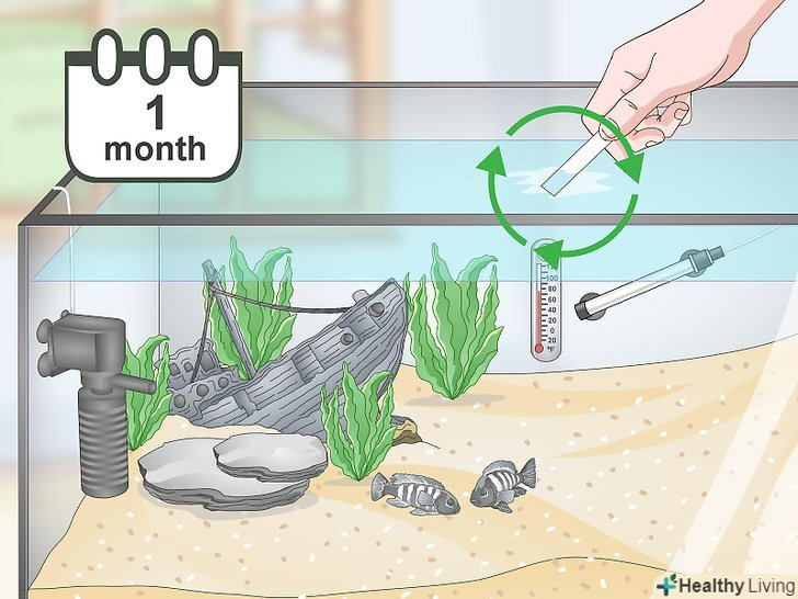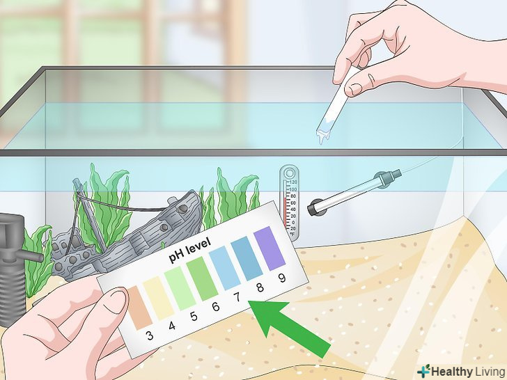 Мінімум протягом одного місяця тестуйте параметри води щодня. коли в акваріумі почнуть жити риби, вони будуть харчуватися і залишати відходи своєї життєдіяльності, які можуть порушити сталий баланс. Тестуйте параметри води щодня або через день, щоб переконатися в сталості рівня pH і відсутності зростання рівня аміаку. [19]- При необхідності піднімайте і знижуйте рівень pH в акваріумі, щоб він знаходився на рекомендованому для ваших риб рівні.