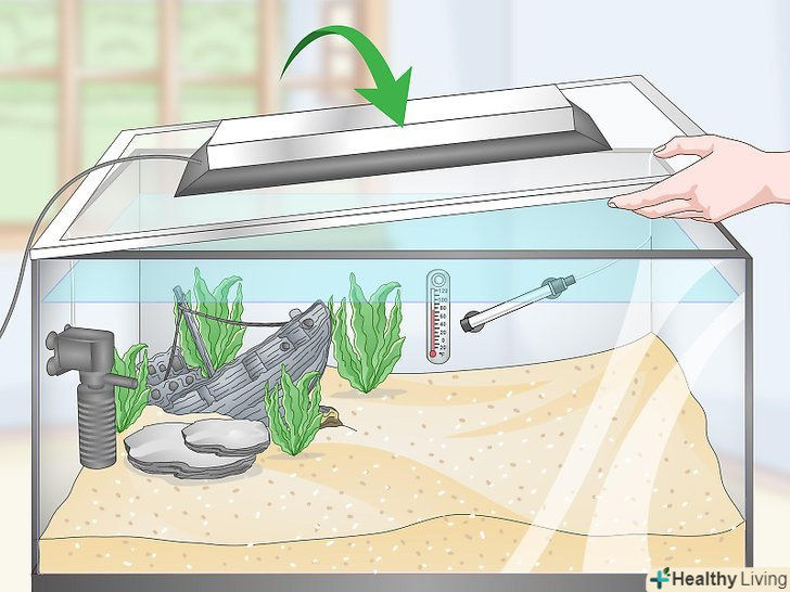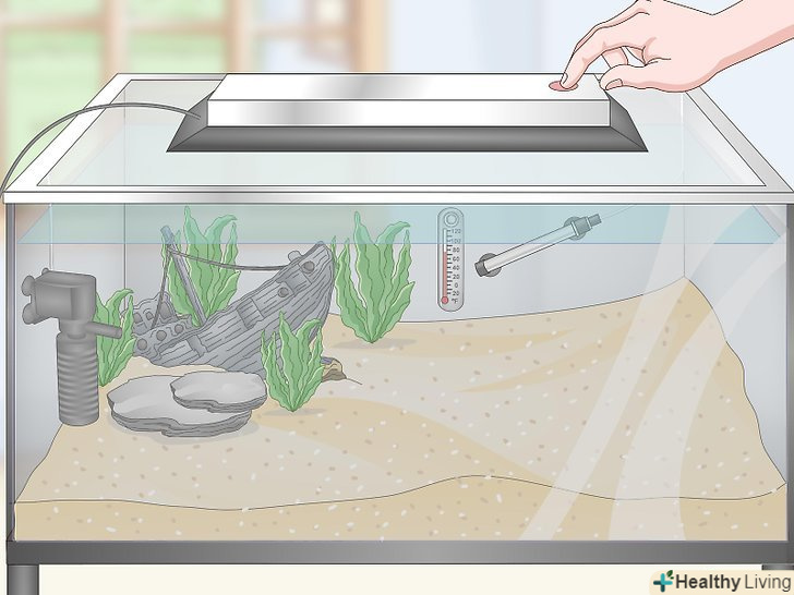 Встановіть на Акваріум кришку з підсвічуванням. кришка захистить акваріум від попадання всередину небажаних предметів, а підсвічування дозволить нормально розвиватися рослинам. Якщо в кришку вашого акваріума не вбудована підсвічування, окремо купіть в зоомагазині акваріумну лампу на 18-40 Вт або замовте її через Інтернет. [13]- Простежте за тим, щоб лампа підсвічування також була підключена до мережі з петлею на дроті, щоб знизити ризик удару електричним струмом і ризик короткого замикання.
