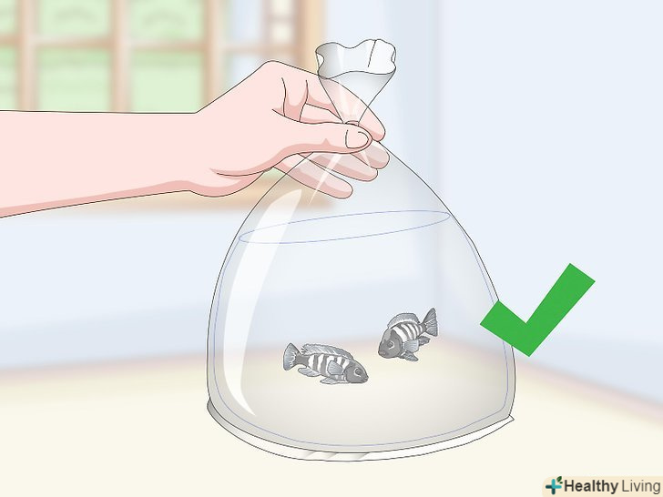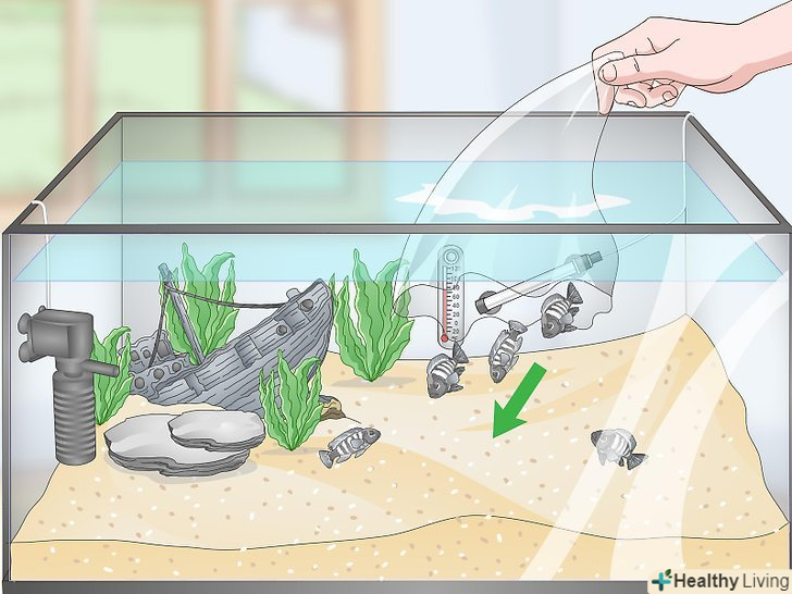 Дозвольте Рибам адаптуватися до температури води в акваріумі, перш ніж випускати їх в нього. Пустіть пакет з купленими рибами плавати в акваріумі для плавного вирівнювання температури води. Приблизно через 20 хвилин додайте в пакет воду з акваріума, вдвічі збільшивши її обсяг. Зачекайте ще 20 хвилин, перш ніж виловлювати рибу з пакета сачком і пересаджувати в акваріум. [17]- Якщо ви відразу ж виллєте рибку разом з водою в акваріум, то можете шокувати її, що погано позначиться на її здоров'ї. Вищевказана процедура допоможе плавно адаптувати рибу до нових параметрів води.