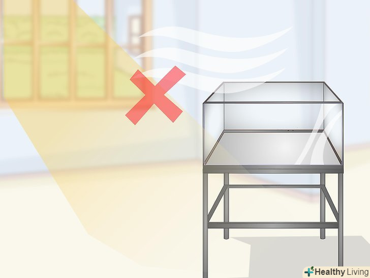 Тримайте Акваріум подалі від прямого сонячного світла, холодних протягів і вібрацій. Тропічні риби дуже чутливі до температури і шуму, тому акваріум з ними слід захистити від усього того, що може їх потривожити. Поставте Акваріум там, де на нього не буде потрапляти занадто багато прямого сонячного світла або протягів від відкритих вікон. Також акваріум повинен розташовуватися досить далеко від аудіоколонок, які можуть бути джерелом сильних вібрацій. [2]- Установка акваріума в кутку кімнати дозволить вам уникнути багатьох з потенційно можливих проблем. Також при цьому буде знижений ризик того, що хто-небудь випадково перекине Акваріум.