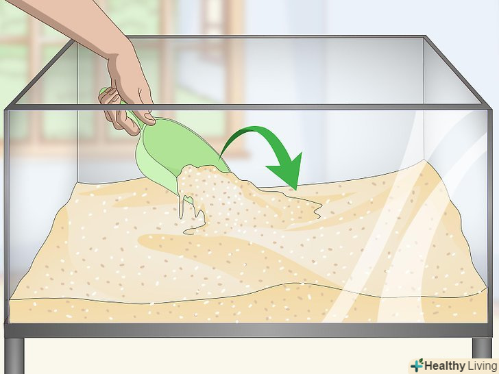 Насипте в акваріум шар промитого гравію товщиною 5-10 см. купіть в місцевому зоомагазині пакет акваріумного гравію або іншого відповідного грунту. Промийте грунт чистою водою у відрі або друшляку, перш ніж засипати його в акваріум. Починайте роботу зі створення шару товщиною в 5 см у переднього скла і поступово перейдіть до шару в 10 см на задньому плані. [5]- Для додавання гравію використовуйте совок або невелику лопатку. Не потрібно просто насипати гравій, так як це може викликати появи подряпин і відколів на акваріумному склі, через які воно може ослабнути.