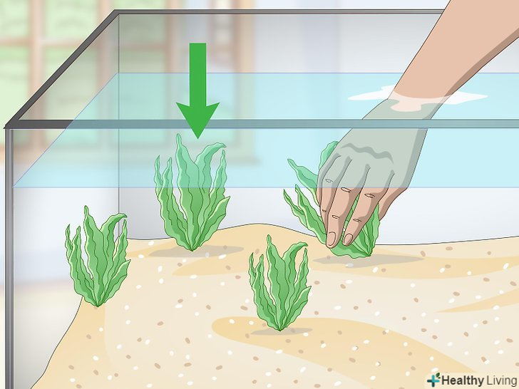 Посадіть в акваріум живі рослини. вони будуть сприяти збагаченню води киснем і надавати акваріуму більш природний вигляд. У зоомагазині можна придбати як живі, так і штучні Акваріумні рослини. Їх коріння (або підстава) слід засипати гравієм для посадки і закріплення на певному місці. [7]- У більшості випадків більші рослини садять в акваріум на задній план, а більш дрібні — на передній.