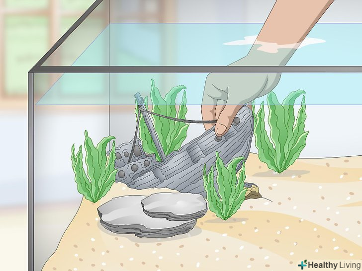 Прикрасьте Акваріум кількома декораціями. кілька яскравих декорацій, наприклад у вигляді невеликого затонулого корабля або декількох великих каменів, дозволять розбити простір акваріума і надати вашим Рибам місця для укриття. Щоб Акваріум виглядав цікавіше, помістіть 1-2 великі декорації з його боків. [8]- Залиште приблизно ⅓ простору акваріума порожній, щоб риби могли вільно плавати. Вони повинні мати можливість спілкуватися між собою, а при необхідності ховатися в укриттях, але при цьому акваріум не повинен бути перенаселений і перевантажений вмістом.