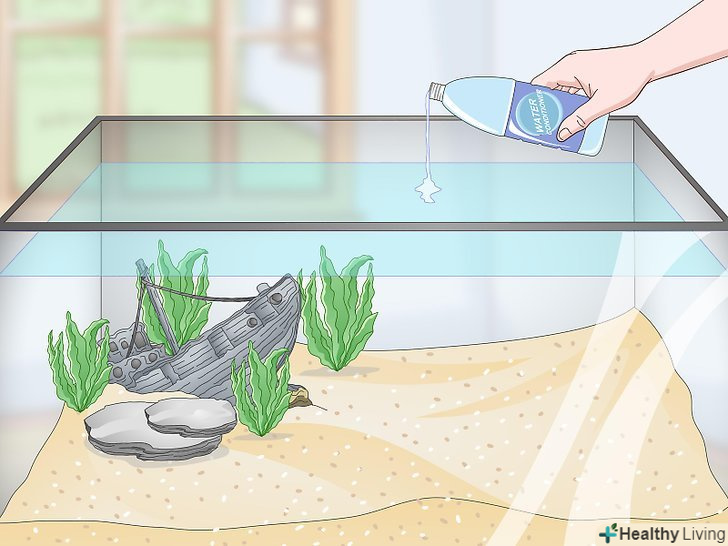 Дехлорируйте воду. у більшості випадків у водопровідній воді міститься деяка кількість хлору, який небезпечний для всіх акваріумних риб. Щоб риби не захворіли, обробляйте воду для акваріума спеціальним кондиціонером, який видалить з неї хлор. Для досягнення найкращих результатів дотримуйтесь інструкції до використовуваного кондиціонера. [9]- Придбати кондиціонер для підготовки акваріумної води можна в місцевому зоомагазині або замовити через Інтернет.