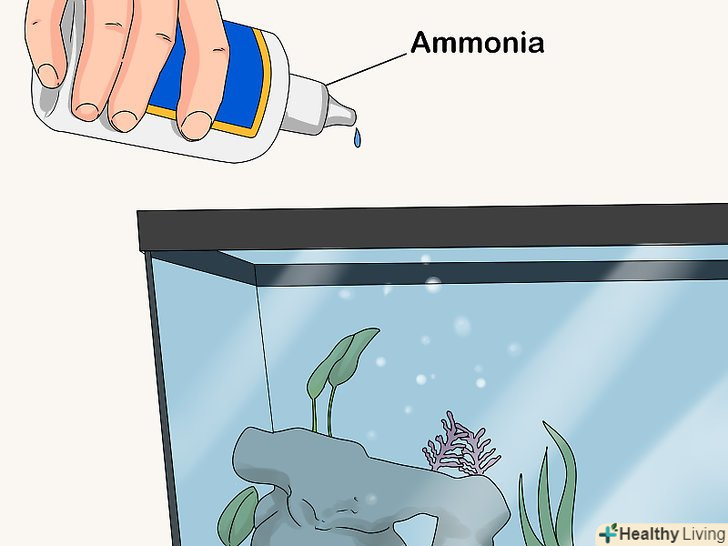 Додайте краплю нашатирного спирту на кожні чотири літри акваріумної води. після того як ви заповните акваріум водою і розмістіть в ньому все необхідне, за винятком самих рибок, слід додати туди нашатирний спирт, щоб у воді розмножилися корисні бактерії. На кожні чотири літри води знадобиться одна крапля нашатирного спирту. Кожен день додавайте в воду необхідну кількість нашатирного спирту. [10]- Якщо обсяг акваріума становить 40 літрів, слід додати 10 крапель нашатирного спирту.